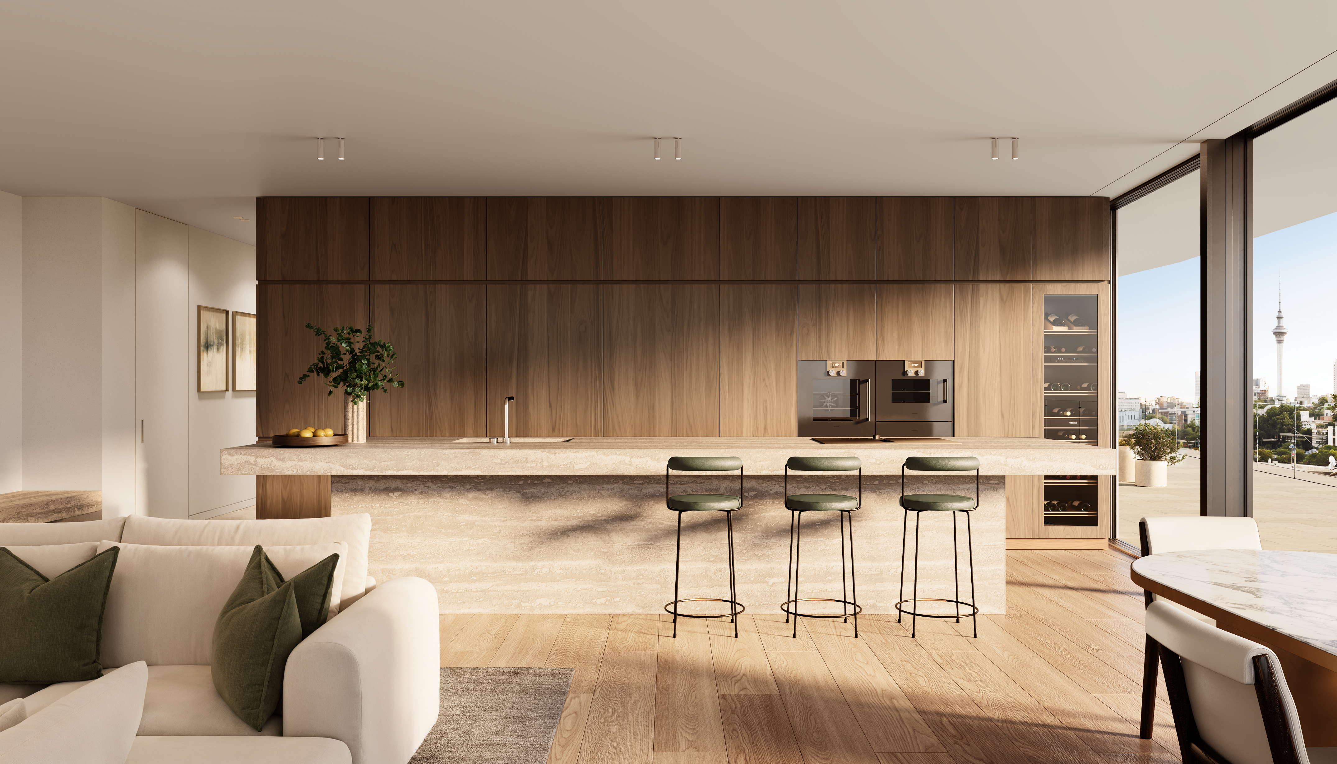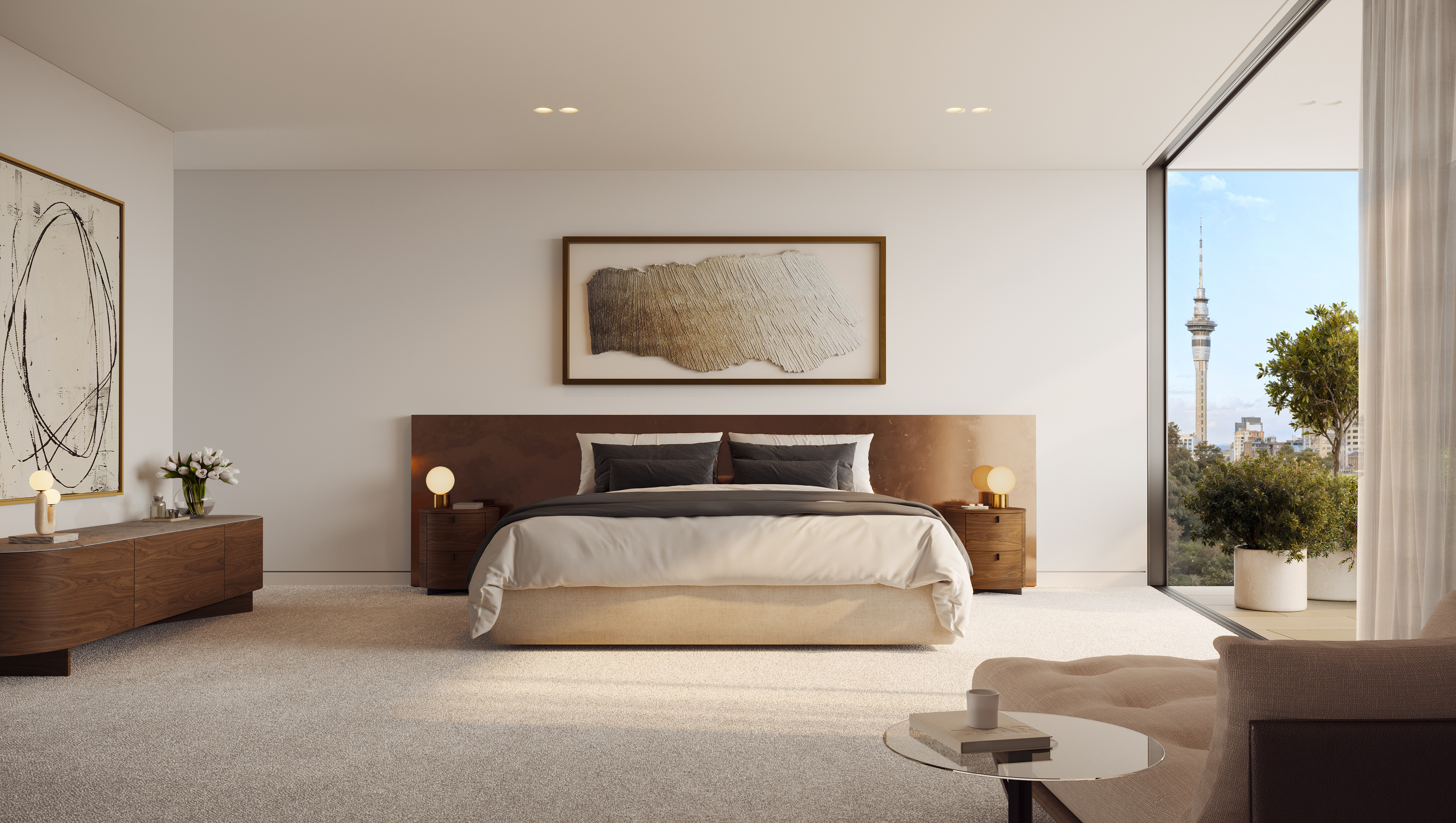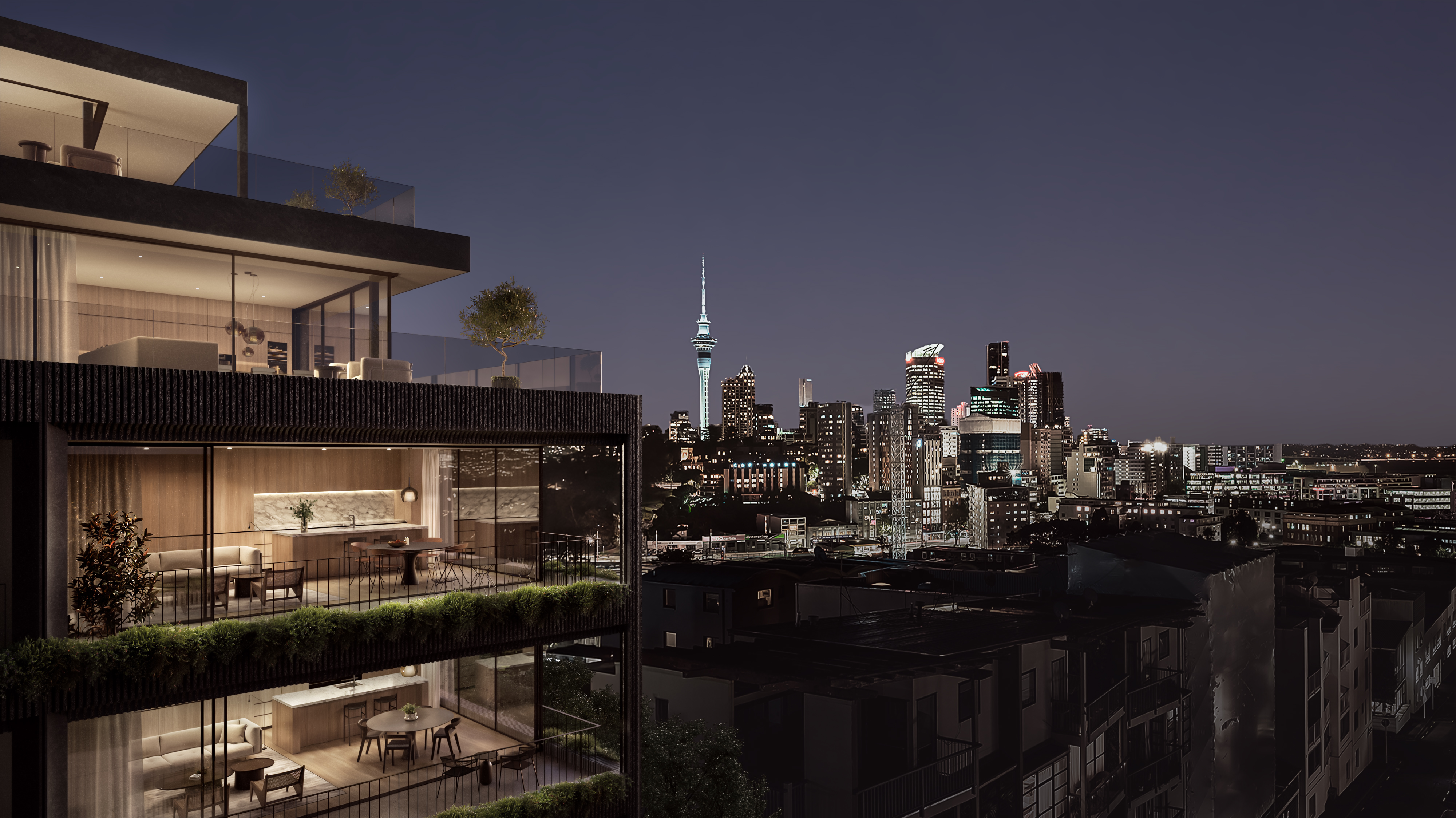 Occupying the top two levels are eight exquisite penthouses, these exclusive homes capture panoramic vistas, stretching northeast to Rangitoto Island and Waitemata Harbour, the CBD to the northwest, and the serene Auckland Domain to the southwest.