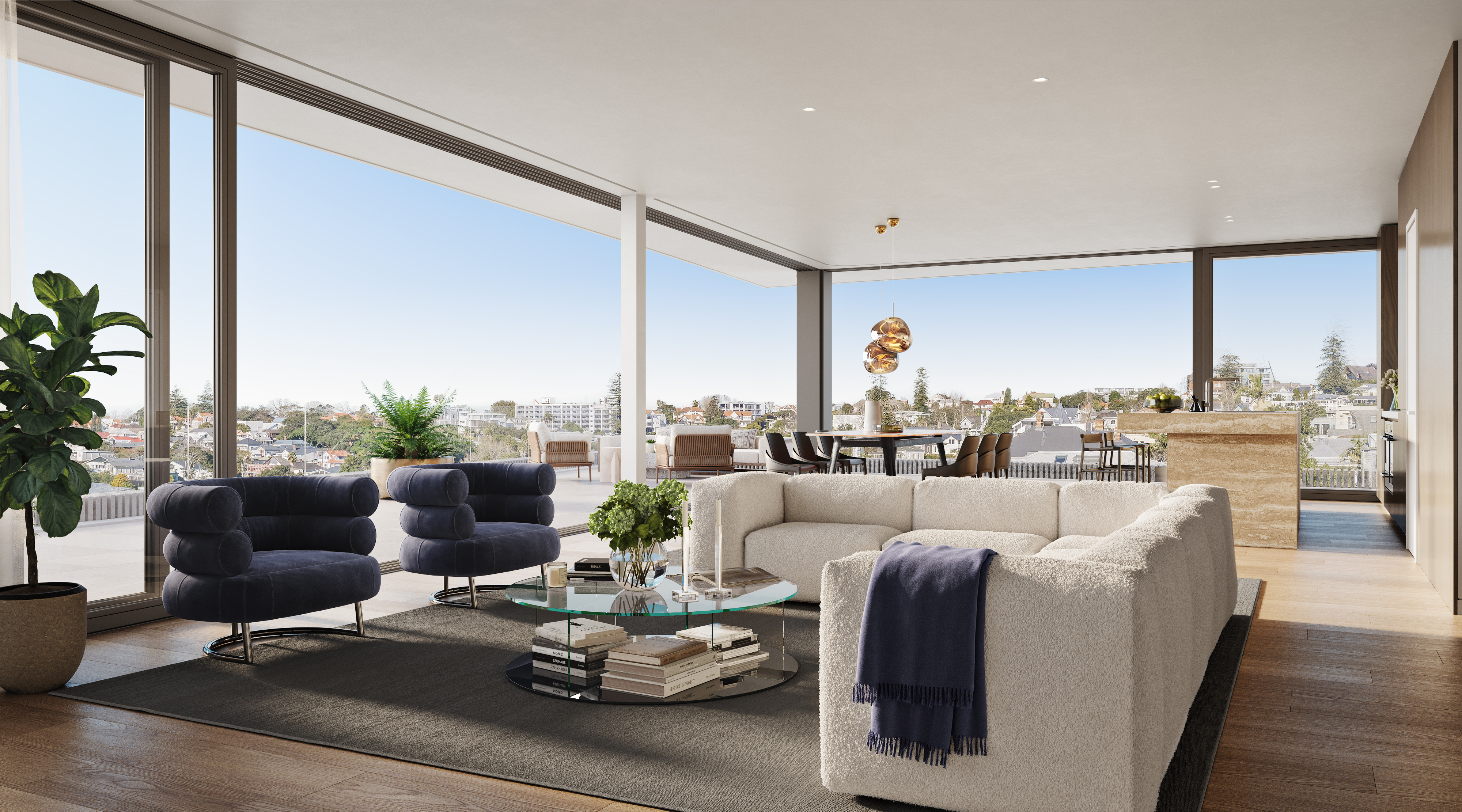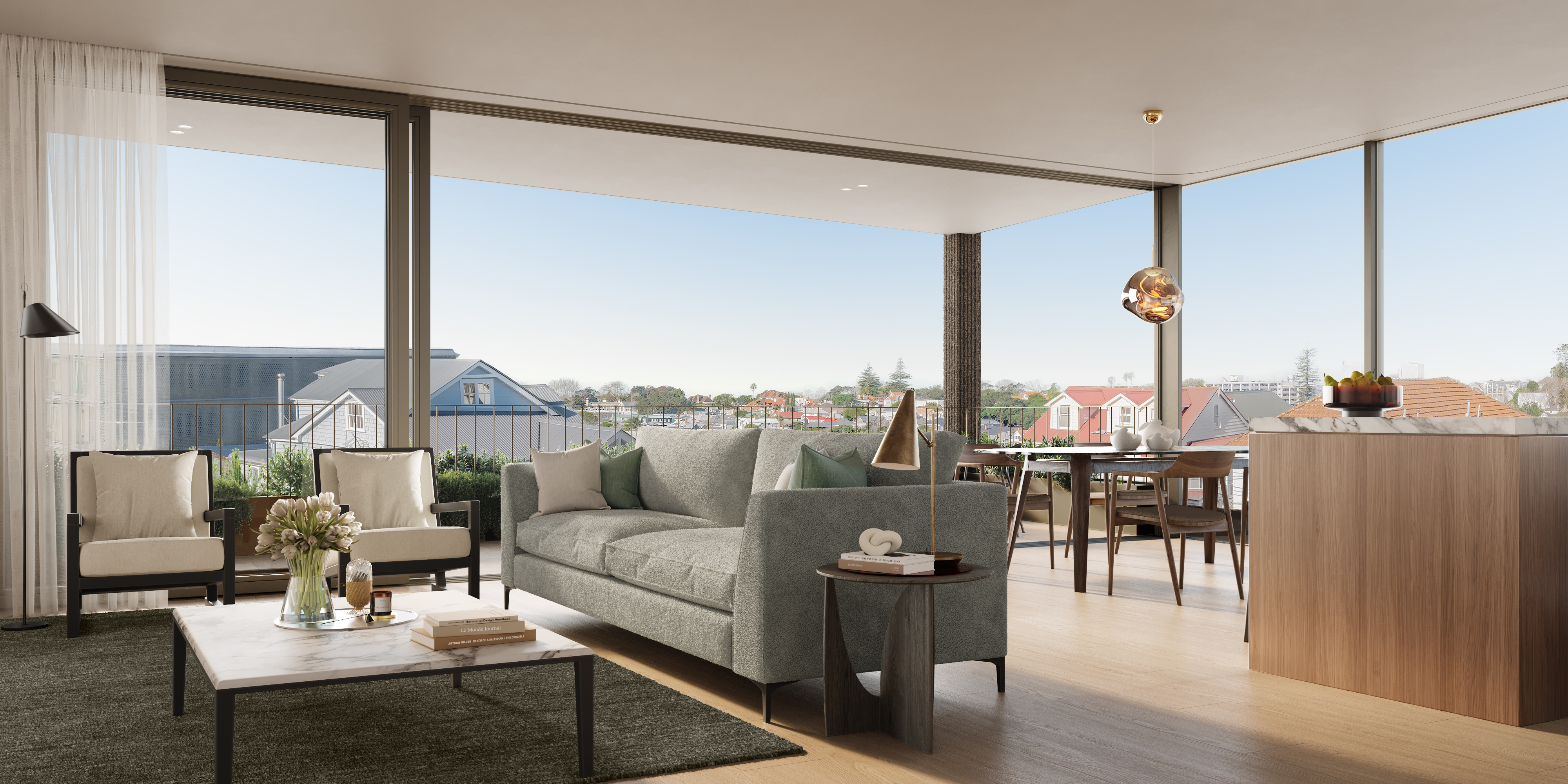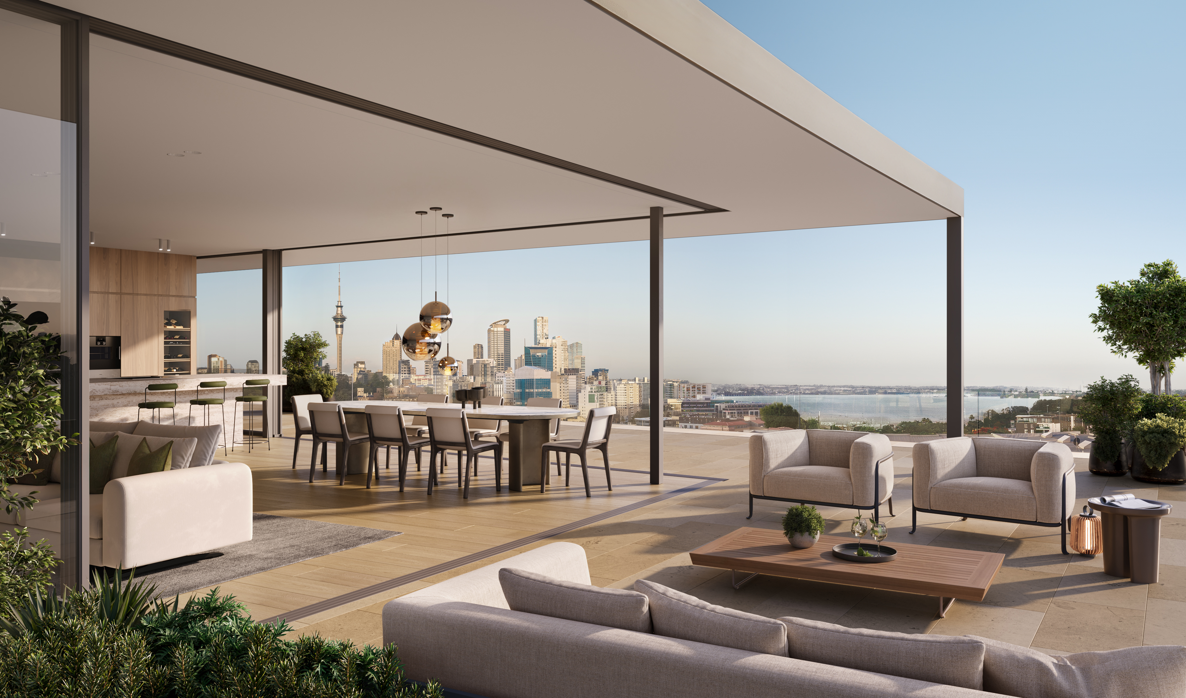 Occupying the top two levels are eight exquisite penthouses, these exclusive homes capture panoramic vistas, stretching northeast to Rangitoto Island and Waitemata Harbour, the CBD to the northwest, and the serene Auckland Domain to the southwest.