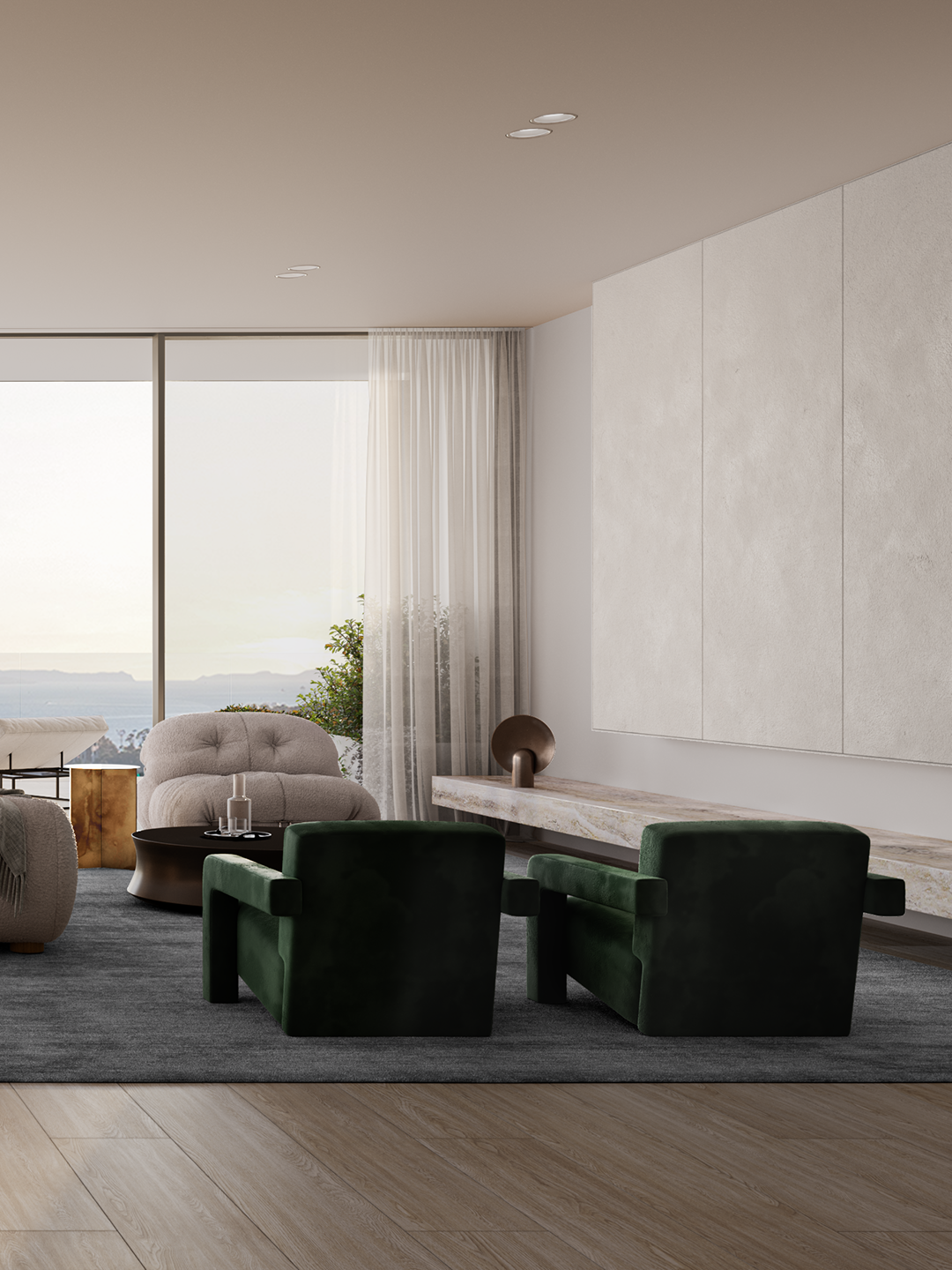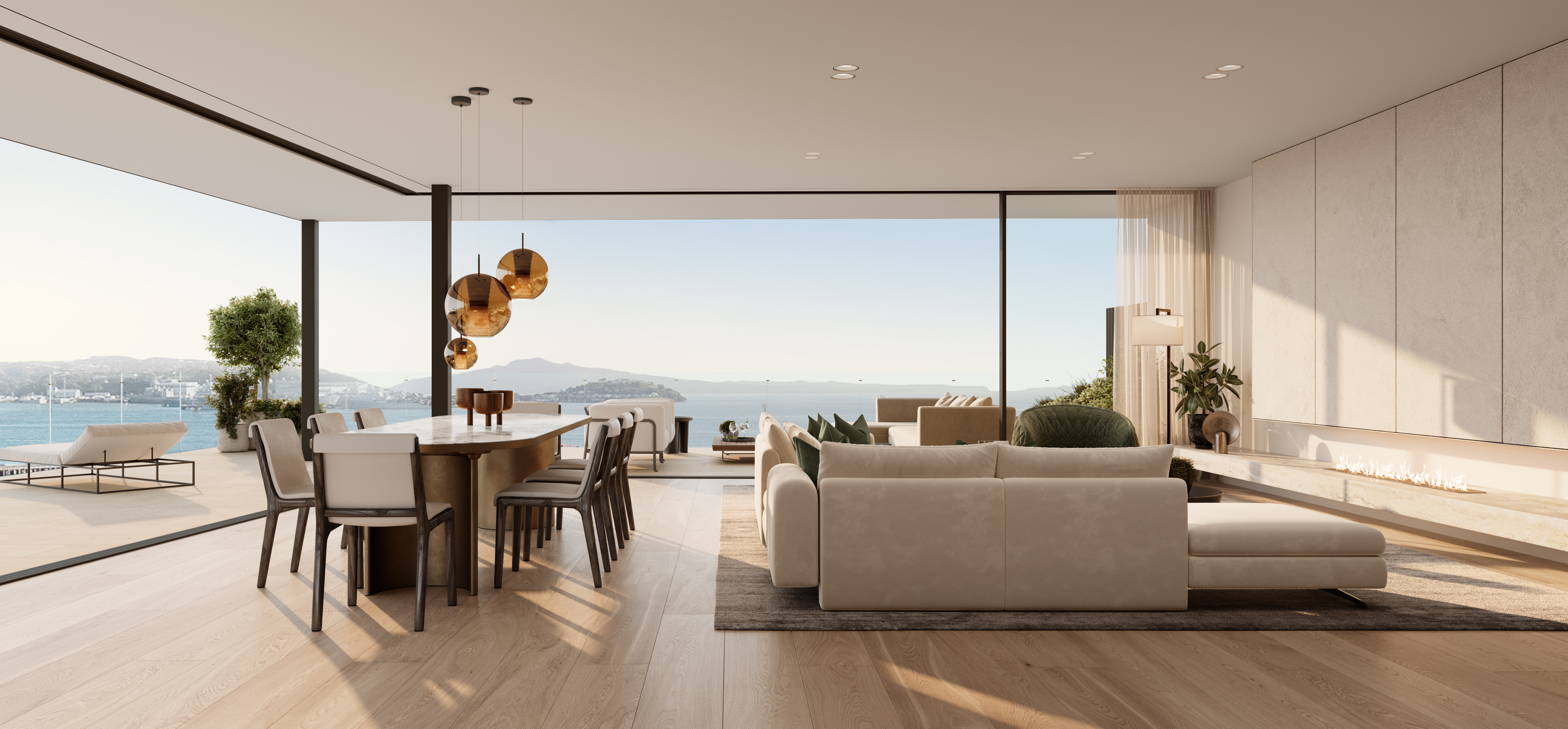 The interiors showcase a warm, textured material palette that amplifies the stunning views framed by floor-to-ceiling glass. Expansive living and entertaining areas flow effortlessly onto the balconies, creating a seamless connection to the outdoors. Nature is thoughtfully incorporated into the design with stone, oak floors, and an obsidian framework, while bespoke cabinetry upholds a minimalist aesthetic.