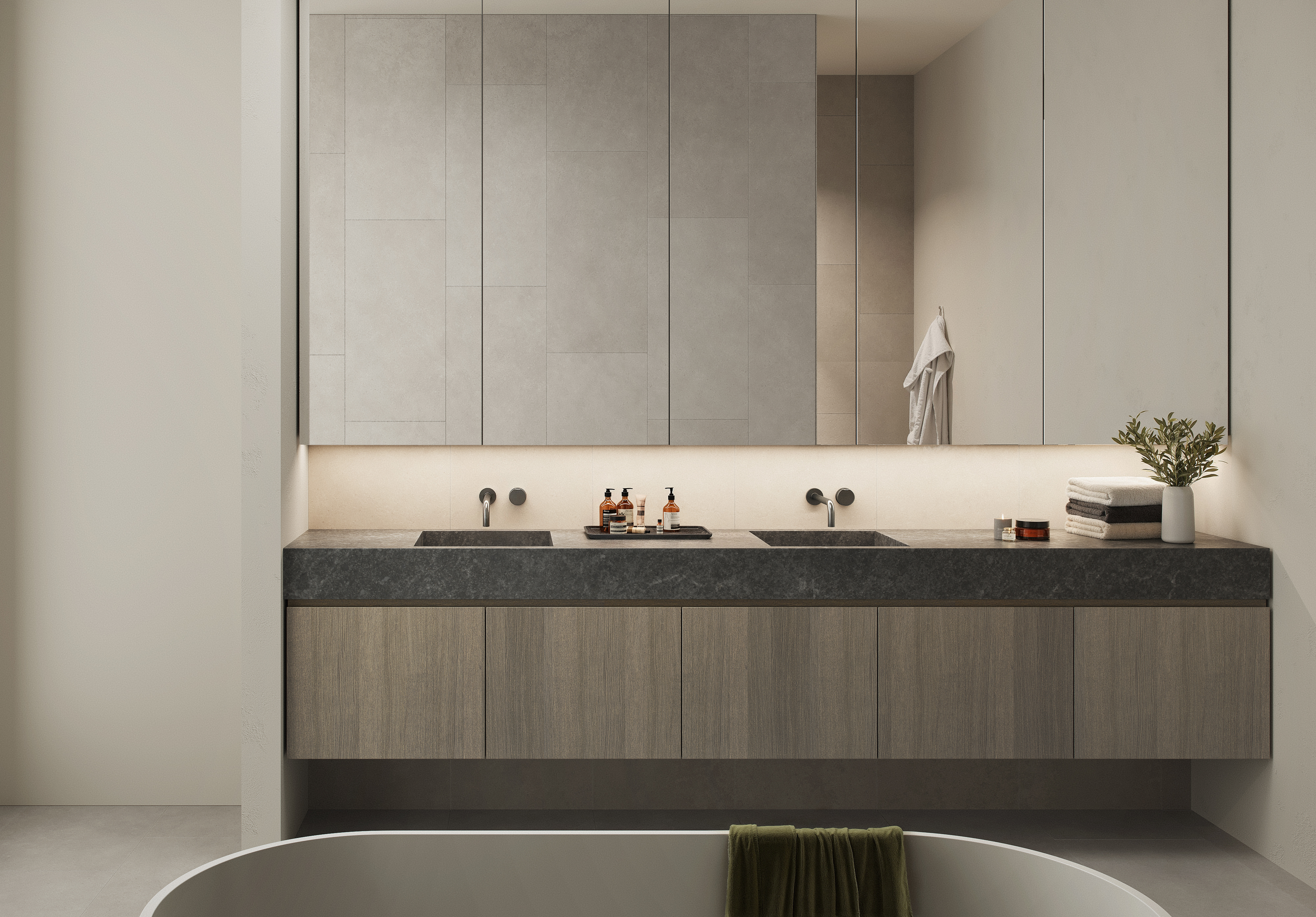 Drawing from its historic context and the surrounding volcanic environment, York House’s facade of bespoke charcoal concrete pleating makes an enduring statement. Every detail of the architecture is meticulous, from the curved articulation of the building along its boundary to the rounded moments found within each home.