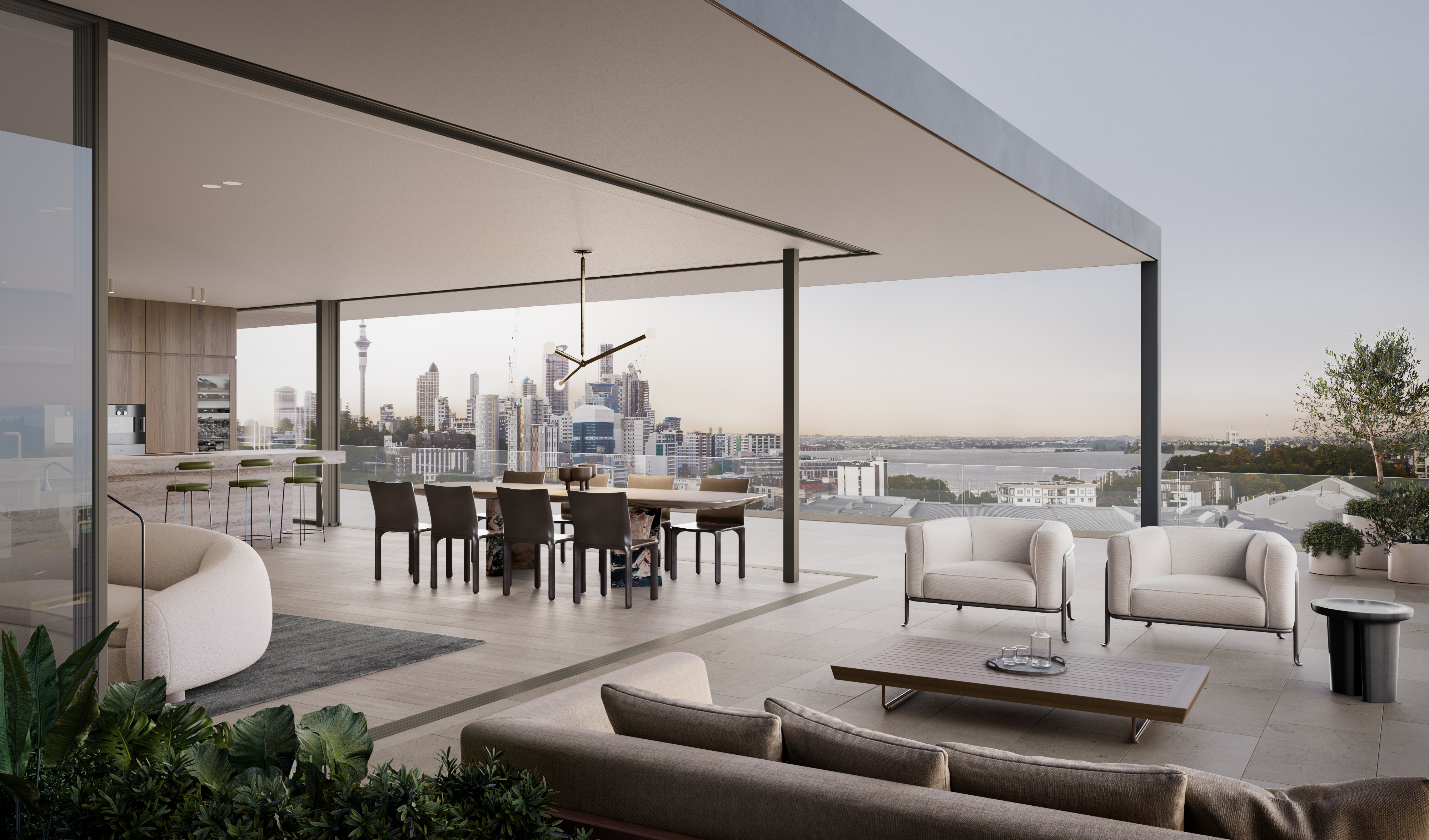 On the penthouse levels, expansive terraces – some as large as 130sqm – are bordered by sleek balustrades, allowing for enviable elevated, uninterrupted views across the Waitematā Harbour and cityscape.